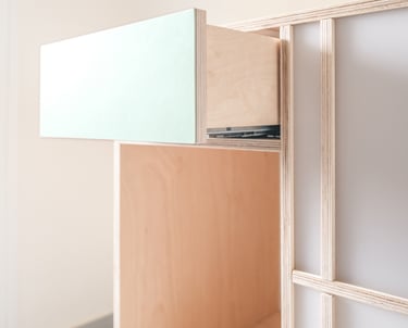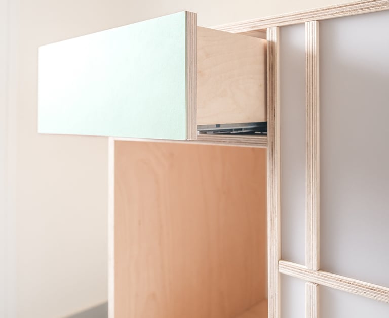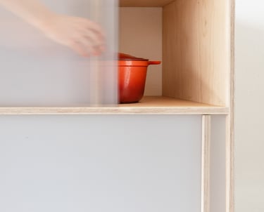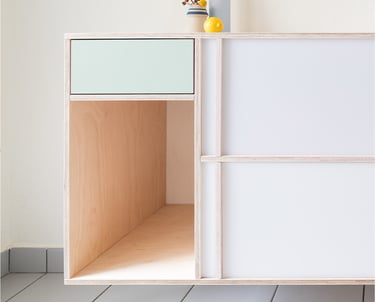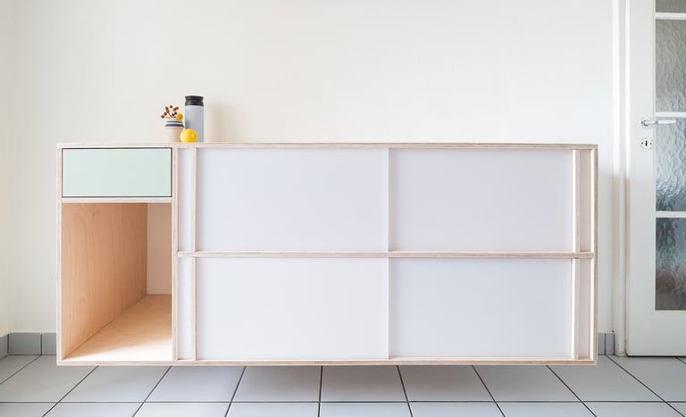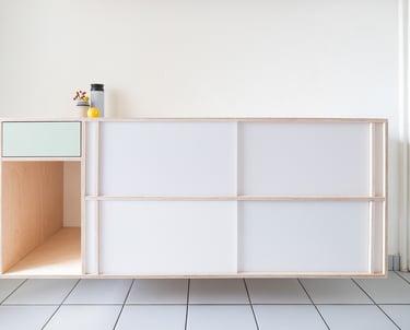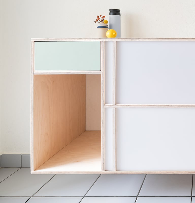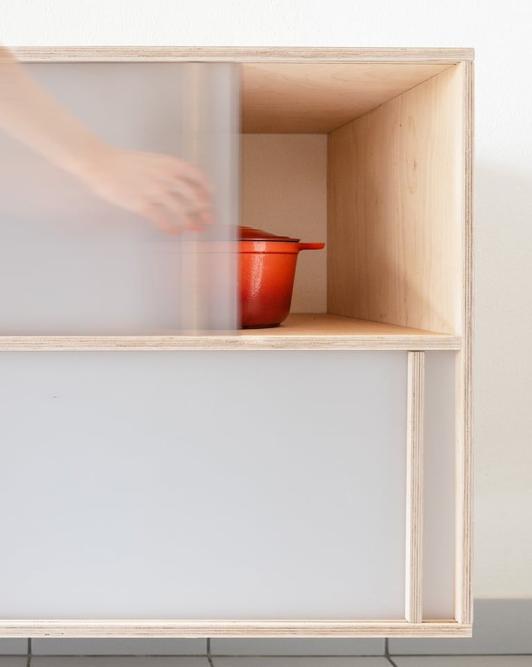 Die Ausgangslage war klar: Der Bereich der Küche soll mit einem Möbel nicht nur optisch, sondern auch platzsparend aufgewertet werden und gleichzeitig als Arbeitsfläche dienen. Entstanden ist ein schwebendes Lowboard aus Birkensperrholz mit vier Schiebetüren aus hochwertigem Acrylglas. Durch die konsequente Akzentuierung der Linien des Birkensperrholz wirkt es leicht und unaufdringlich, sorgt durch das Spiel der gradlinigen Geometrie aber trotzdem für das richtige Mass an Aufmerksamkeit.