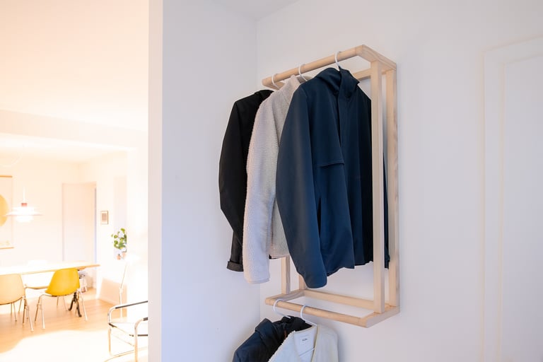 Die Garderobe SQUARE überzeugt mit einem minimalistischen, gradlinigen Design – inspiriert von der Klarheit der quadratischen Form. Sie wird in der Schweiz in einer geschützten Werkstatt gefertigt, ist in Esche oder gegen Anfrage in Nussbaum erhältlich und lässt sich wahlweise frei stehend oder an der Wand montieren. Das Standardformat misst 49 x 100 cm und bietet Platz für etwa 10–15 Kleidungsstücke; die grosse Variante misst 100 × 100 cm und schafft zusätzlichen Stauraum.